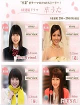 第一集以Kiroro的《Best Friend》为主题,主要讲述充满爱情和友情的高中生毕业故事。志田未来在剧中扮演女高中生主角步美,饰演好友真美的是女星忽那汐里。志田未来说:“步美非常重视朋友,这一点和我的个性很相似,我跟她很有共鸣,我会努力把恋爱中的女孩的可爱传达给大家。” 第二集以EXILE的《道》为主题,国仲凉子在剧中饰演准备结婚的女儿,故事主要讲述她与个性顽固却十分疼爱她的父亲之间的故事。国仲凉子说:“我以前就很喜欢《道》这首歌曲,这部作品讲描写了订婚后准备结婚的女儿和父亲之间的亲子关系,我希望看过之后大家会想到自己的父亲母亲,要尊敬孝顺他们。” 第三集以Sukima Switch的《奏》为主题,讲述正在成长的大学生情侣由梨香和泰树之间的故事,北乃纪伊在和山本裕典在剧中饰演恋人。北乃纪伊说:“至今为止,让我最有毕业感觉的就是从高中毕业成为社会人的瞬间,由梨香有特别小女孩的一面,不过我本身是很爽朗的性格,所以希望把她演成一个又有少女感觉又积极生活的女孩。” 第四集以松任谷由实的《毕业写真》为主题,由长泽雅美主演,她在剧中饰演广播电台的主持人仁美,她在四个故事中都曾出现过。故事主要讲述仁美毕业后到东京工作,遭遇挫折之后,在家乡上一起读高中的同学鼓励她重新开始的故事。长泽雅美说:“能主演松任谷由实的名曲《毕业写真》这样的故事实在太开心了,我想每个人都有不同的毕业歌曲回忆,这次的特别日剧是四个很美的故事,大家一起期待作品播出吧。”